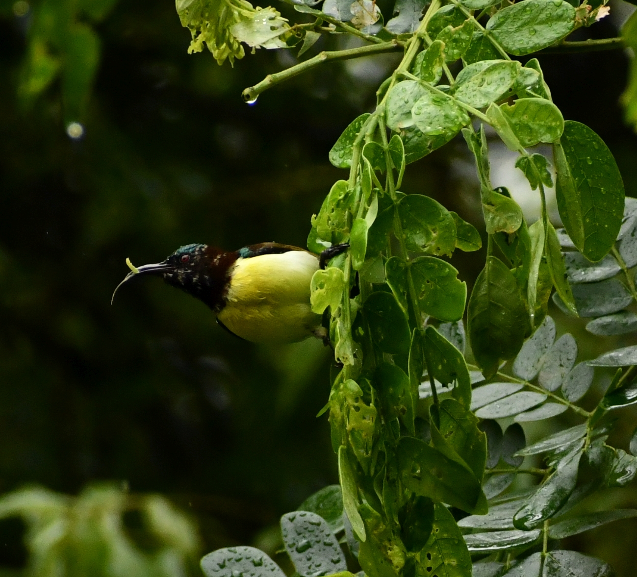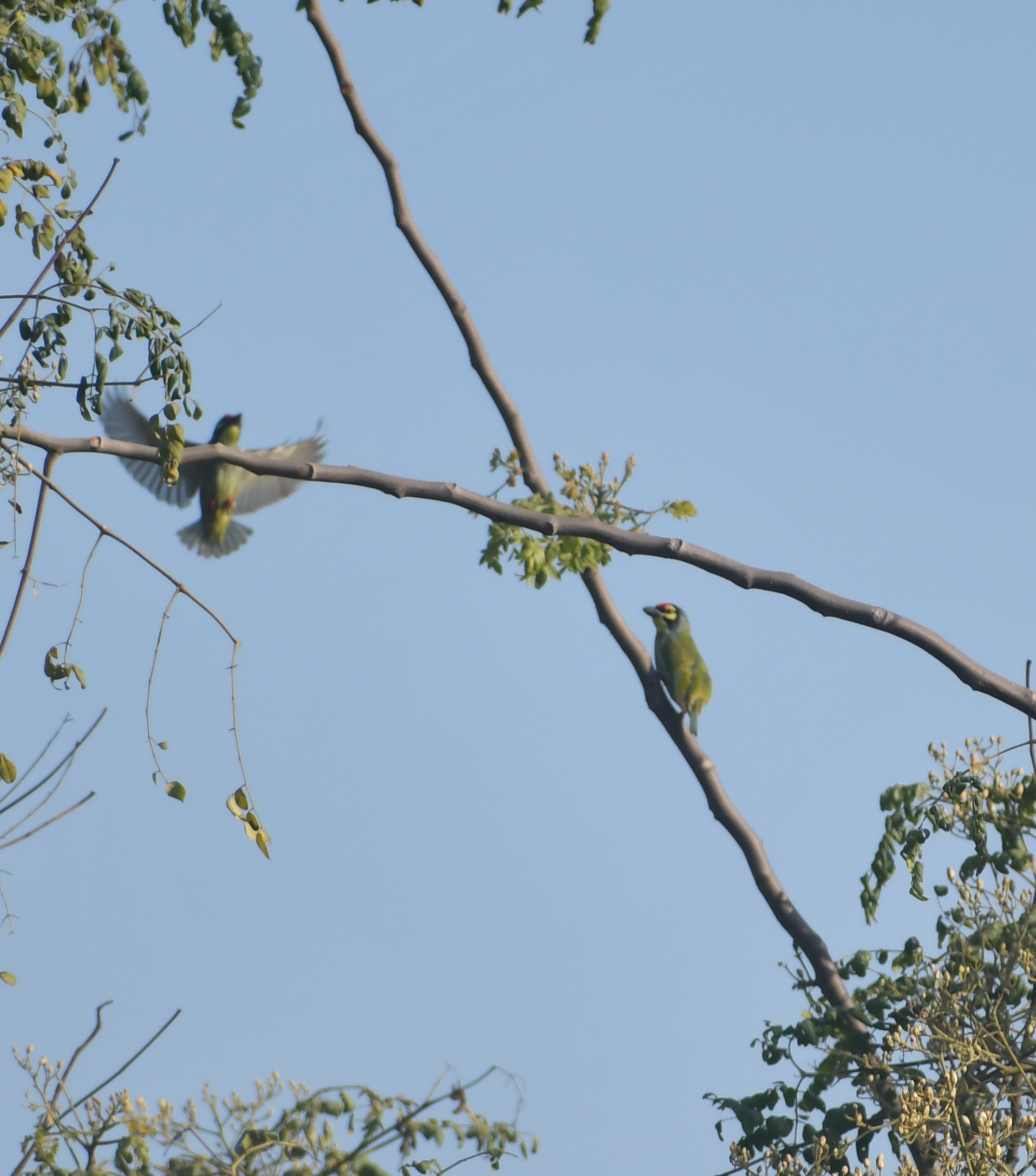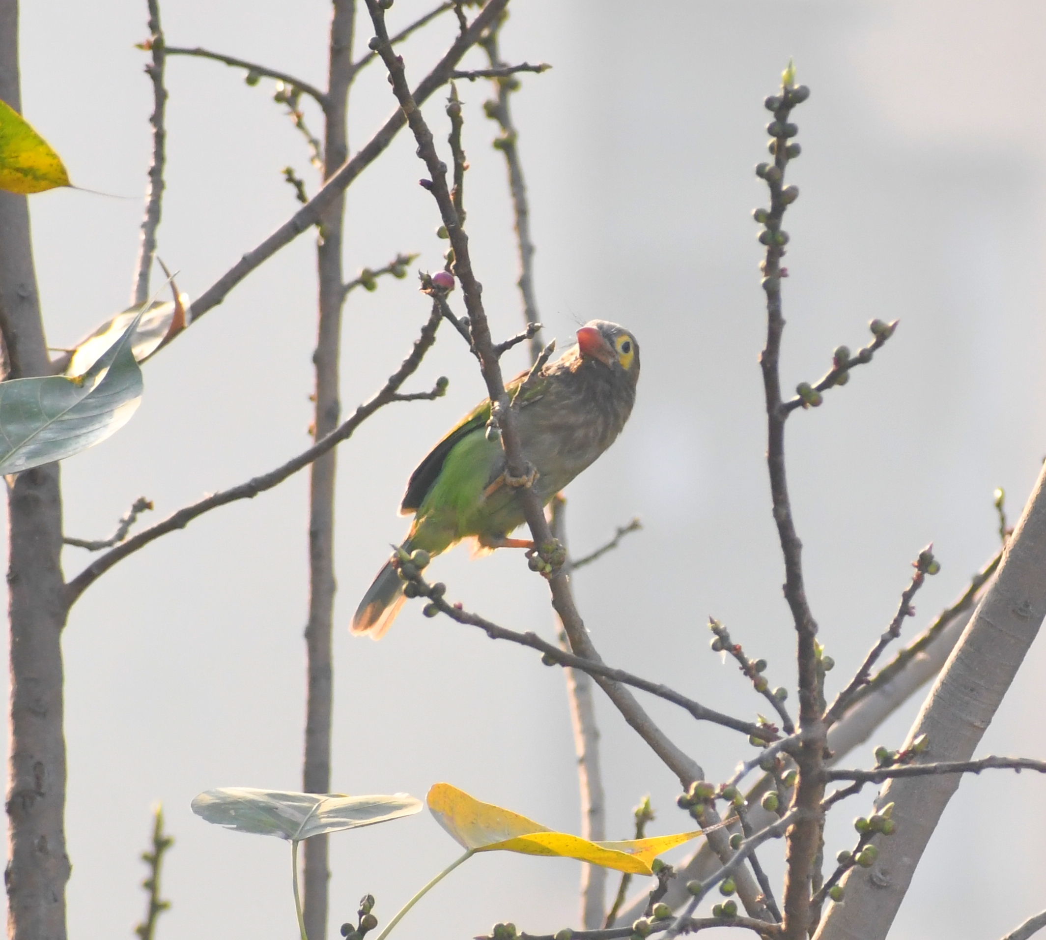 The English and colloquial name of this bird captures two of its most essential characteristics. It gets the name 'coppersmith' from its call. A periodic tok-tok-tok-tok as if someone was hammering iron. Basant Bawdi is spring crazy. We saw this bird everywhere on campus just after winter ended. Calling away all day, everywhere. I remember telling RM that I hear birds playing TT no matter where we go. After a fortnight of going spring crazy ourselves, did we finally tie the call to this bird. You have to see this bird calling. It sways left to right between each call, stopping in the middle to crouch in. It is also one of the most fashionable birds on campus. Sporting a bright green plumage and a striking red forehead crest.