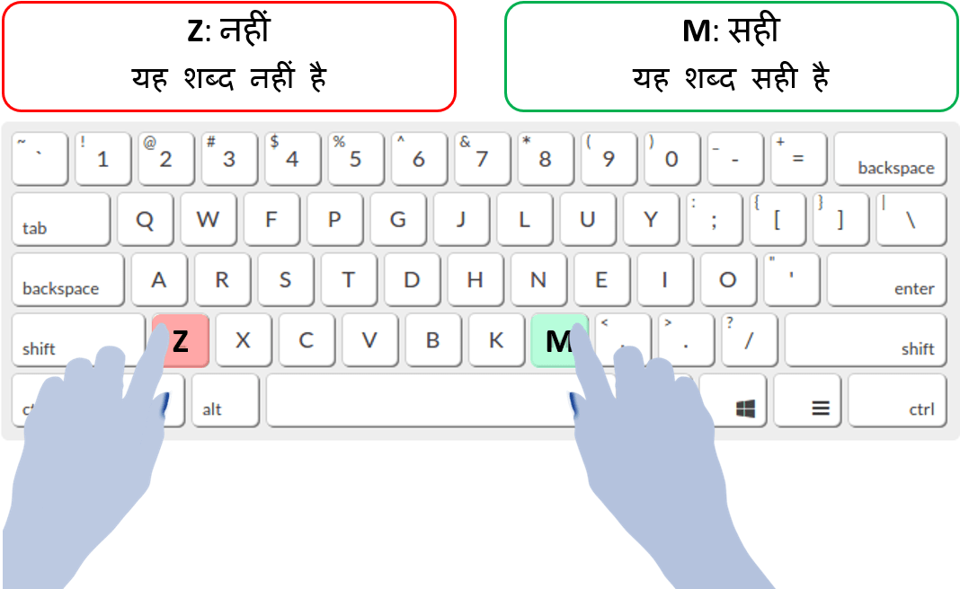 स्क्रीन पर आपको एक हिंदी का शब्द दिखाई देगा, जिनमें से कुछ सच में सही हिंदी शब्द हैं और कुछ बनाये हुए नॉनवर्ड्स हैं, मतलब शब्द नहीं हैं। आपको यह बताना है कि दिखाया गया शब्द एक सही हिंदी शब्द है या नहीं। यदि आपको लगता है कि यह एक सही हिंदी शब्द है, तो आप "सही" पर क्लिक करें, और यदि आपको लगता है कि यह एक हिंदी शब्द नहीं है, तो आप "नहीं" पर क्लिक करें।